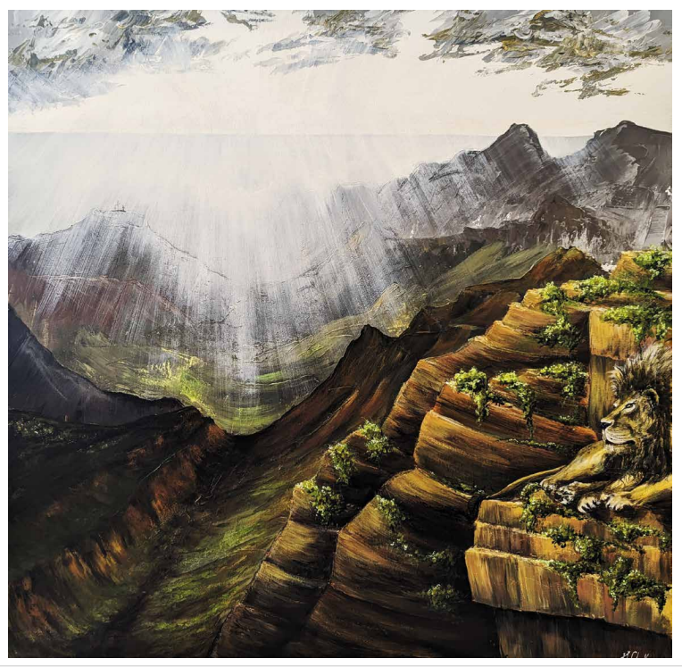 Jesus lies waiting at the base of this painting having traversed the mountains and valleys for us. This is to show that He has already carried out the toughest journey, so we don’t have to fear it anymore. We are promised our glorious destination and all we must do is walk in His tracks.